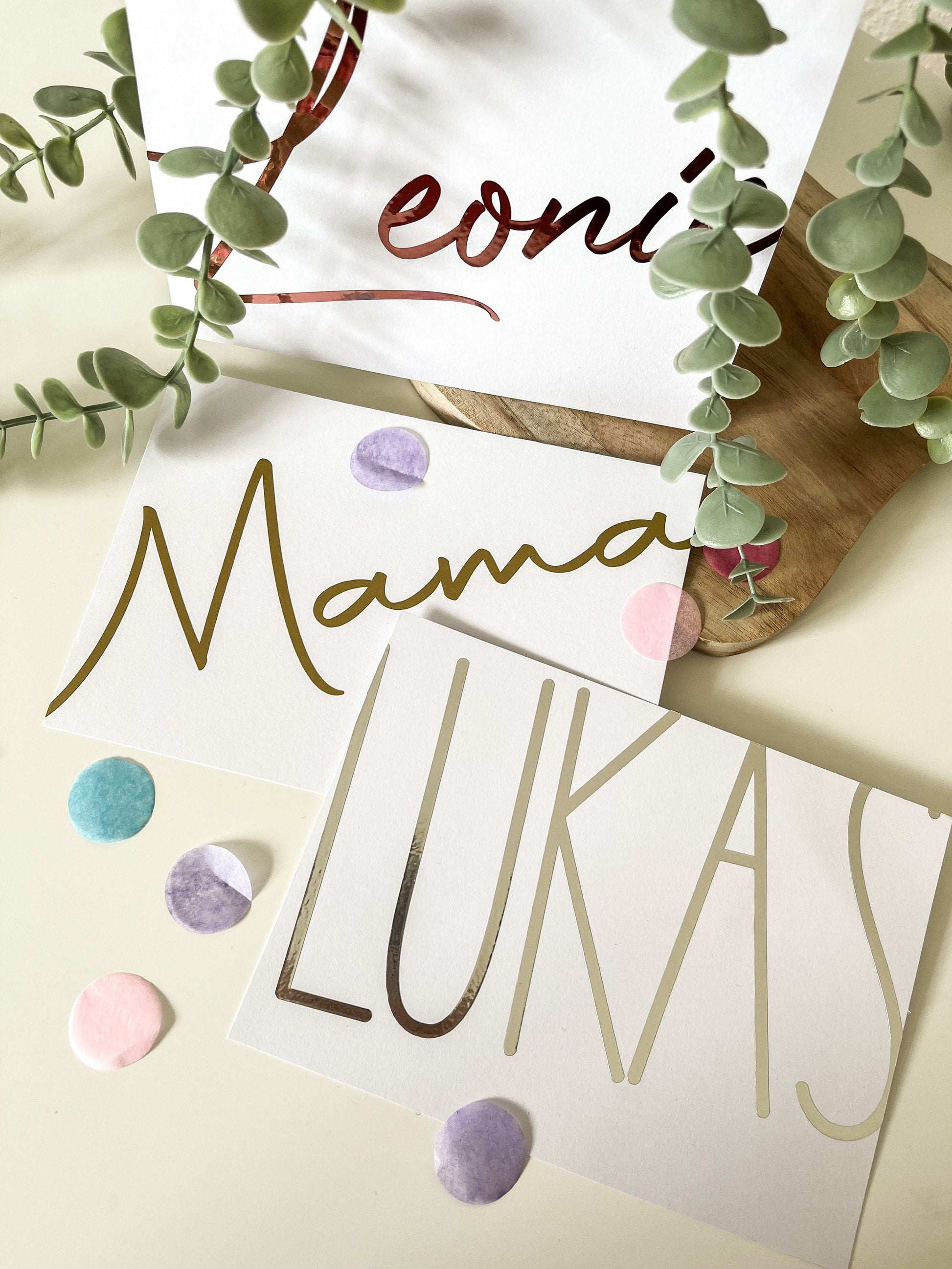 Wählbar sind 3 Schriftarten und die Farben Schwarz, Gold, Silber, Roségold metallic, Gold metallic & Silber metallic.